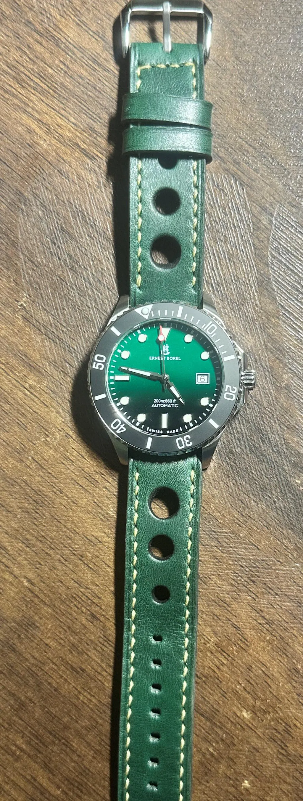I'm quite impressed with the craftsmanship of the strap. It's a sturdy yet supple leather band, and the green color complements my green-dial Ernest Borel watch perfectly. Highly recommendable