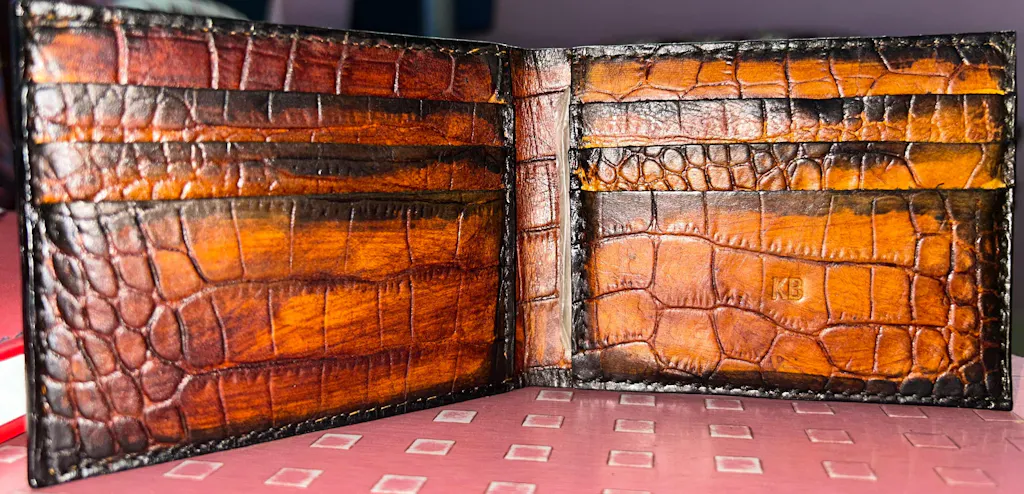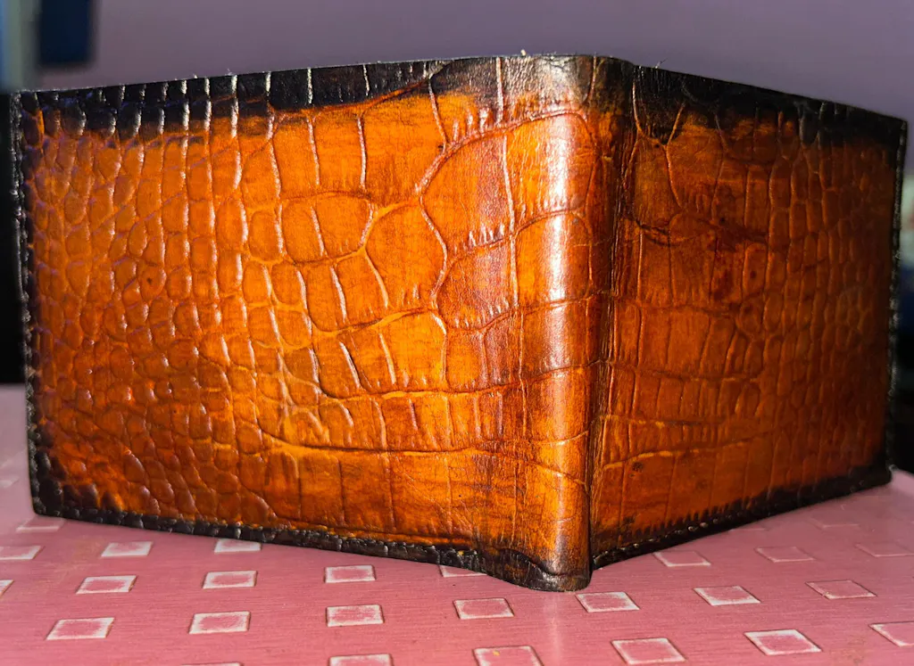 Hand dyed antique finished leather wallet made in full grain crocodile embossed leather. Features 3+ 3 card slot with hidden pockets each and 1 cash clots